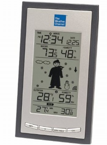 Be prepared for a cold, wet morning with the help of this forecast station and its virtual weather boy, Oscar. From The Weather Channel by La Crosse Technology, the forecast station monitors indoor conditions for enhanced comfort. It also evaluates outdoor temperatures and air pressure levels, which it employs to forecast the weather, depicted using fifteen different Oscar icons. Oscar serves as a great teaching tool for children as he models weather-appropriate clothing under sunny, partly cloudy, rainy, or snowy skies. With its radio-controlled clock, the forecast station provides precise time, resetting daily to the US Atomic Clock and adjusting automatically for daylight savings time.