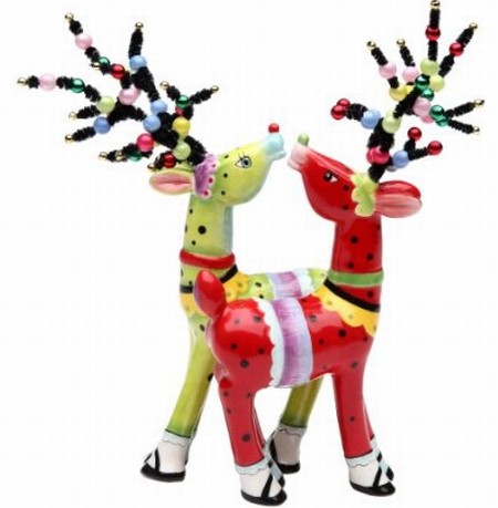 This 6 1/8-Inch reindeer kiss magnetic salt and pepper shaker set, crafted fine hand painted ceramic, adjustable reindeer horn with beads. It can also be used as a beautiful centerpiece for the cake topper. The product is designed by Babs, with a whimsical, stylish and an artist look.